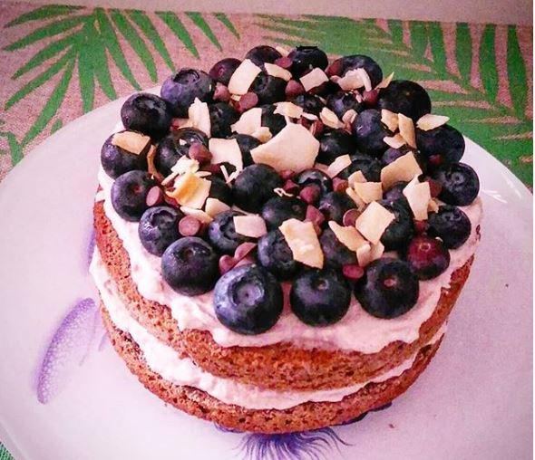 .Mix the cream and jam . Mounting cut the cake into 2 pieces . Spread half of the cream on a portion of the cake add some blueberries .cover of the second part of the cake .make the rest of cream and blueberries . Optional I add some coconut chips and chocolate chips I hope this cake will please you as much as we Have a good day 😘
