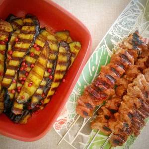 .écrasé une cuillère à café de baie rose dans 2 cuillères à soupe d’huile et badigeonner les aubergines à l’aide d’un pinceau.