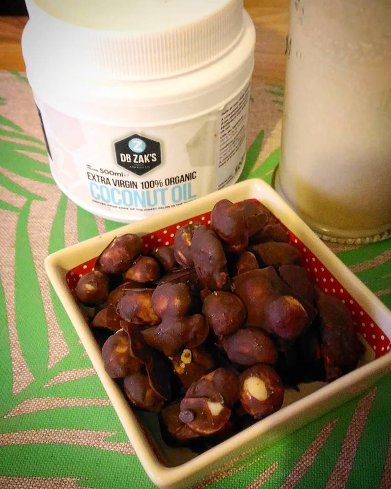 . Faire fondre l’huile de coco et le chocolat environ 2 fois 30 secondes au micro-ondes ou doucement au bain-marie