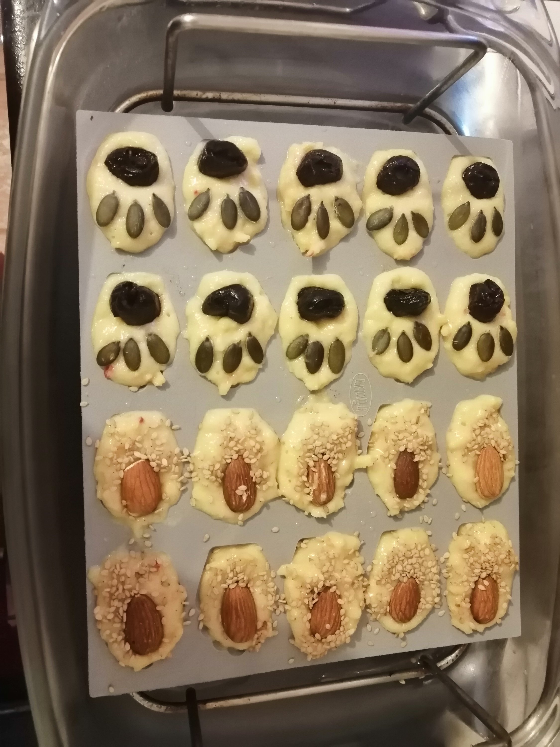 - Mettre ensuite 3 petites graines de courges par Madeleine pour finir de créer les pattes de chats
