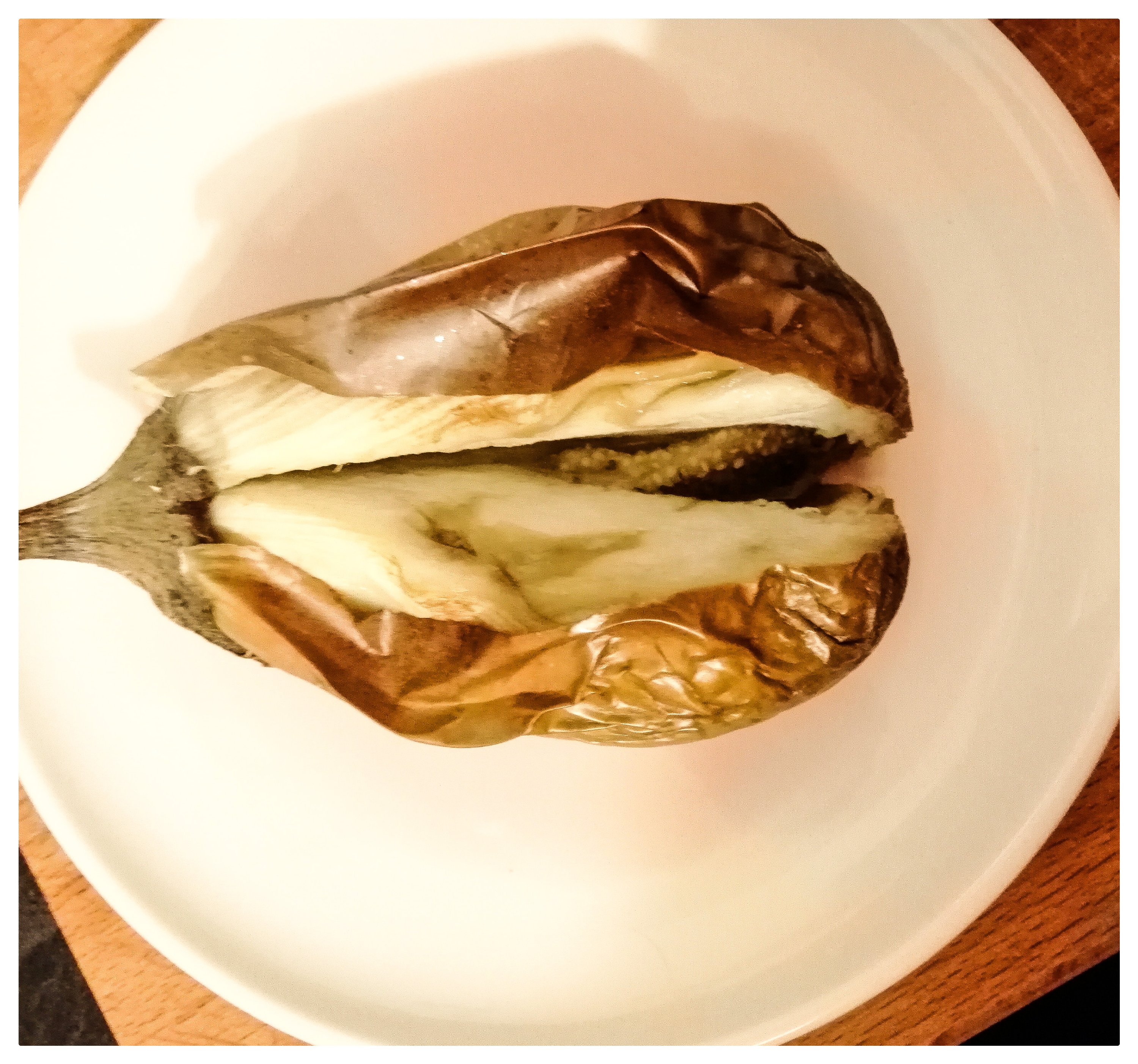 - Dans votre plat, que vous posez sur la grille, mettre les 2 aubergines entières et lavées