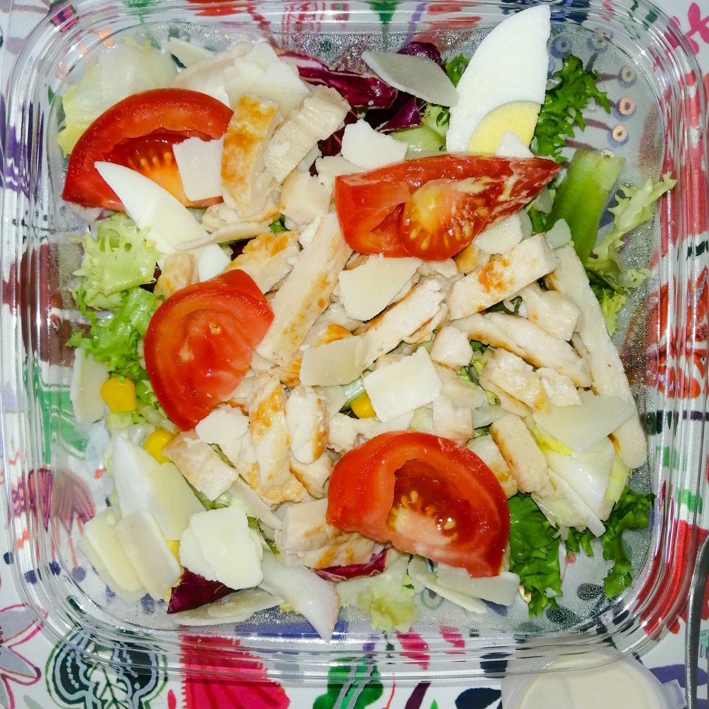 Ici c’est une salade ceasar que j’ai payé 4,20 euros avec une vinaigrette et un morceau de pain que je n’ai pas pris évidemment 😜 dommage qu’elle n’est pas eu un peu de pain energus à la place. Mais bon peut étre un jour on trouvera du pain #lowcarb dans nos boulangeries.