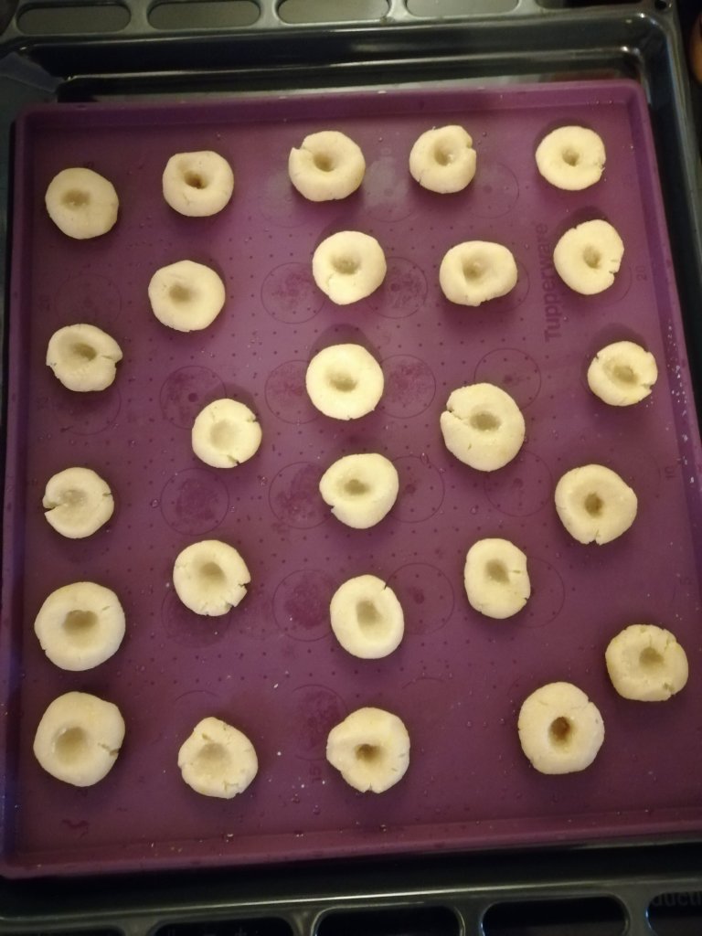 - Pendant ce temps former des petites boules en les applatissant un peu et avec son petit doigt appuyer en leur centre pour former le petit trou